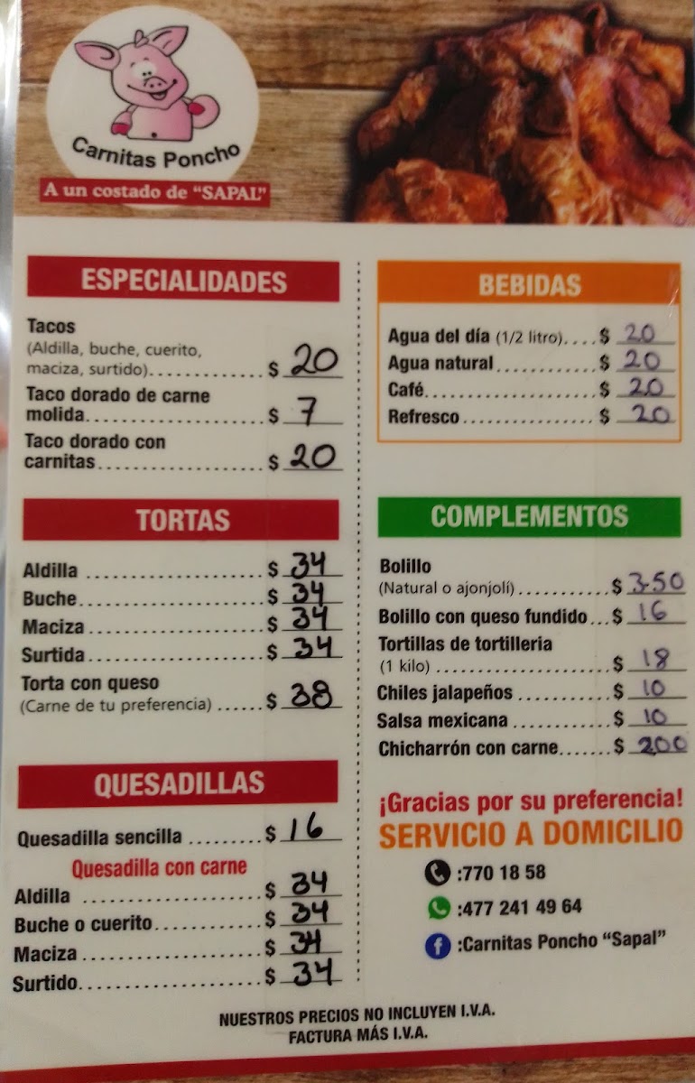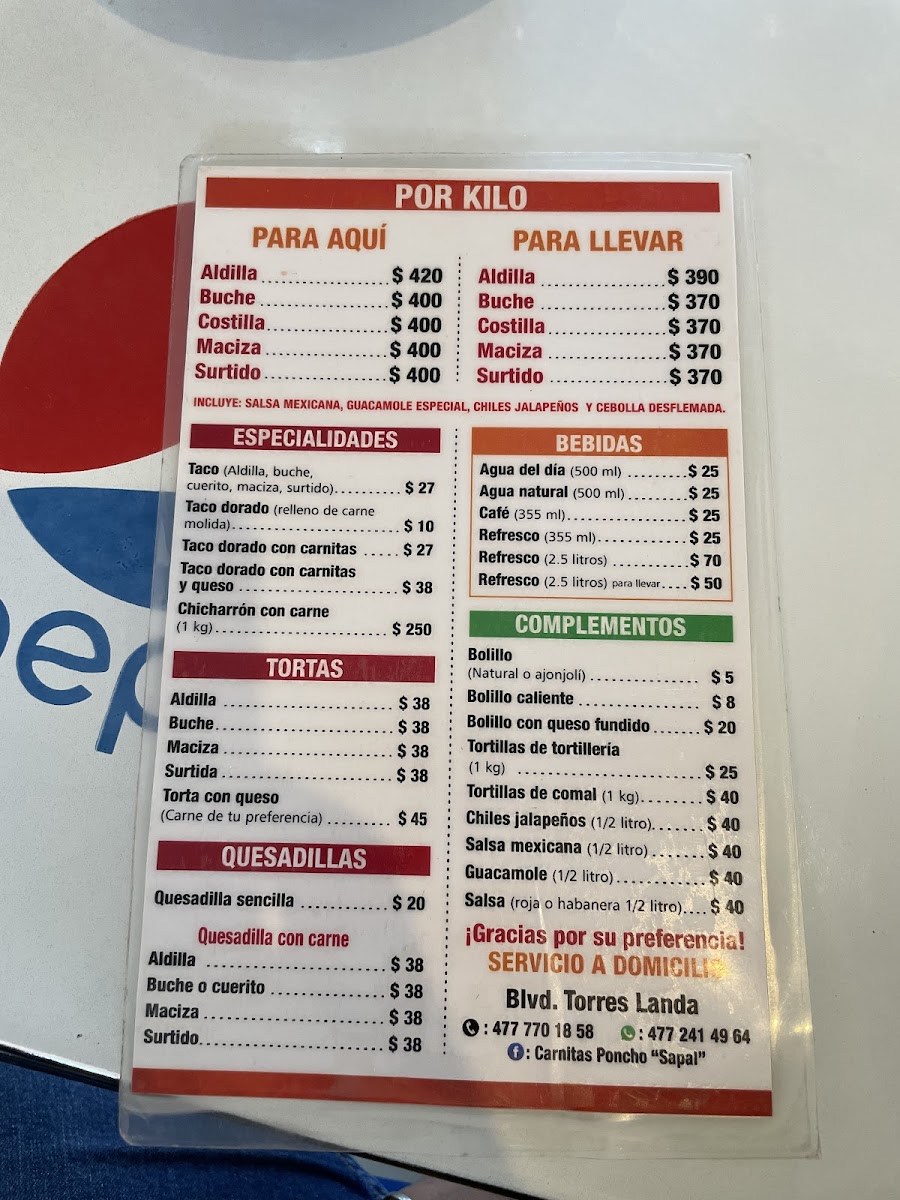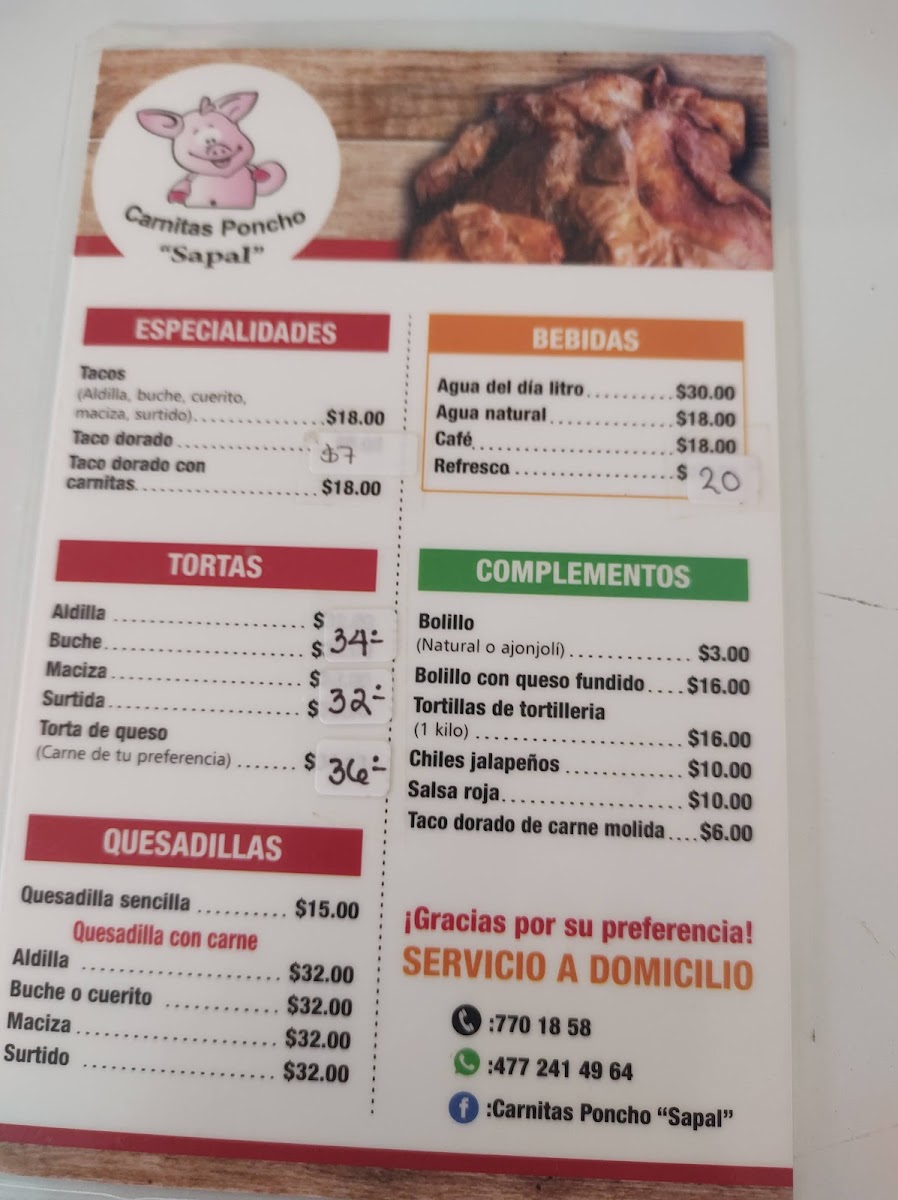 Introducing the menu at CARNITAS PONCHO SAPAL, located in the heart of León de los Aldama, this eatery is a haven for carnitas lovers. Renowned for its fast service and exceptional quality, each dish is crafted to deliver a delightful culinary experience. Customers rave about the freshness of the meat and the clean atmosphere, making it a perfect spot for both dining in and takeout.